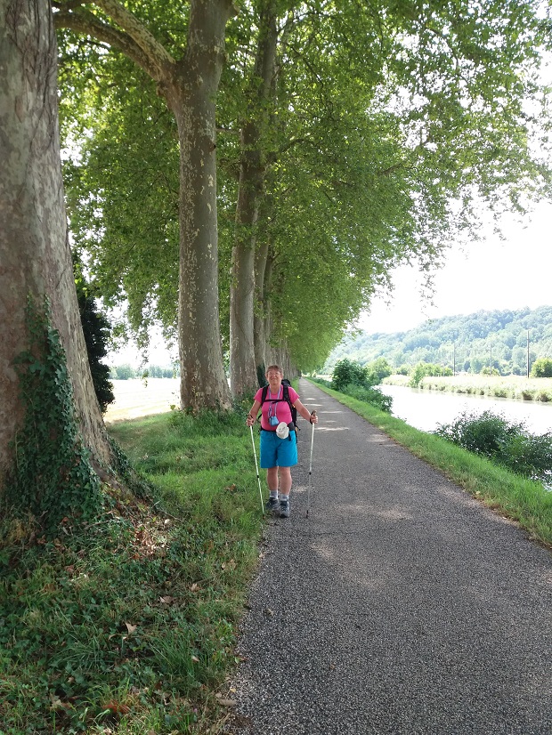 Il y a 2 sentiers possible : le long du canal ou le sentier des collines avec de beaux points de vue mais plus technique : il monte, il descend, c'est un peu boueux... Nous décidons de suivre le canal parce que le terrain est plat et puis c'est très beau aussi près du canal, c'est calme et paisible, presque reposant. Nous rappelons le gîte pour quelques consignes et Yolande, notre hôtesse, nous annonce qu'il reste encore 9 km ! Oups ! nous n'avions pas prévu de faire encore autant de kilomètres !! Tant pis, on fera contre "mauvaise distance bon pied". Nous sommes loin de Moissac, on ne va pas faire demi-tour... Tant pis pour les pieds, tant pis pour la fatigue, nous oublierons tout ça plus tard... Après tout le terrain est plat, l'air frais près du canal et la route bien goudronnée et ombragée. Nous arrivons chez Yolande après avoir fait quelques courses au village. Le boucherie nous vendra un plat préparé de salade de pommes de terre avec beaucoup de gras et en grande quantité : nous en aurons encore le lendemain après en avoir retiré deux bonnes cuillèrées à soupe de gras. Il nous a vu venir, il ne nous reverra pas. Il y a aussi une belle boulangerie avec du pain excellent : cette boulangerie abrite le 3ème ouvrier de France pour les baguettes... Miam.